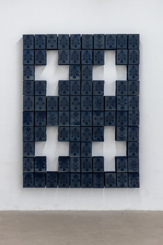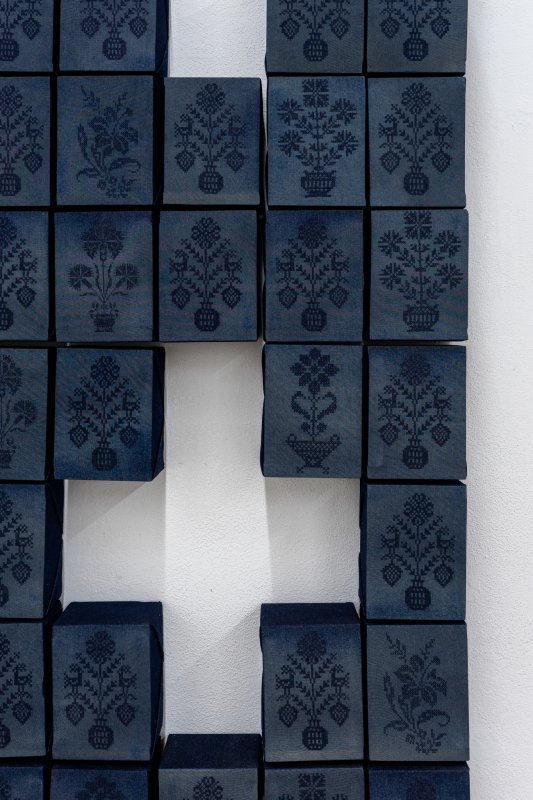 Growing up between Vienna and my grandparents’ farm in Carinthia, areas of tension and contrasts have shaped my life from an early age onwards. I thus saw the work "Maria F." as an opportunity to further approach the subject of structure and culture. The cross structure suggested here is based on the traditional form of the brick stable windows, which are found on my grandparents’ farm. This hard motif is broken up by lovely floral elements, which have their origins in the Carinthian Kreuzstich. The 80 pieces together form a large flower bed, each work created by utilizing the industrial production method of laser technology, however each component is unique.