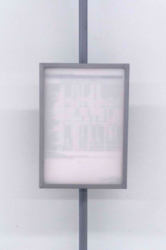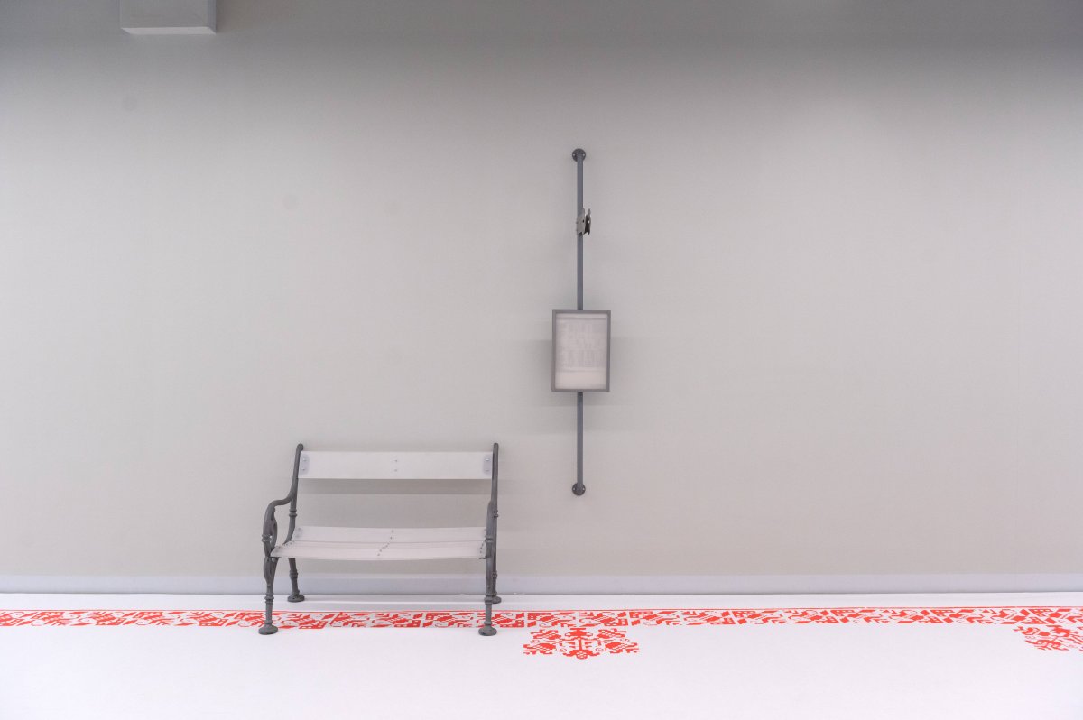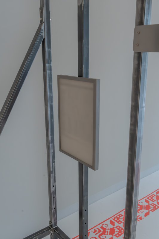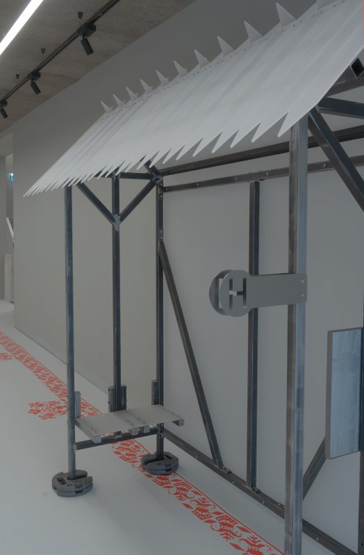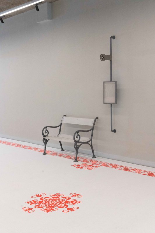 The floor of the installation preserves a fragment of history and identity. Wanker’s oversized, digitized tablecloth – originally hand-stitched in cross-stitching technique by his grandmother – becomes the monumental foundation of the piece. This traditional Carinthian embroidery embodies the structure and stability of inherited values – a neatly woven grid that offers support, but can also feel confining, a framework one might try to break free from. By translating it into digital form and producing it with industrial materials like plexiglass and metal, Wanker heightens this contrast.